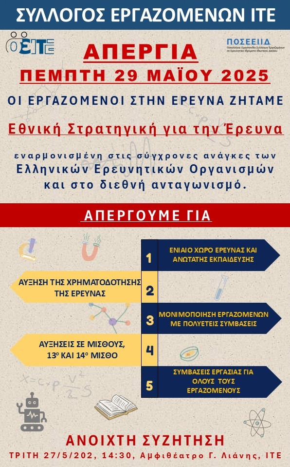 Επίσης, καλούμε όλα τα μέλη της κοινότητας του ΙΤΕ την ΤΡΙΤΗ 27/5/2025 στις 14:30 στο Αμφιθέατρο Γ. Λιάνης στο κεντρικό κτήριο του ΙΤΕ στο Ηράκλειο, σε μια ανοιχτή συζήτηση-ενημέρωση με στόχο την αναλυτική ενημέρωσή σας για τα ζητήματα που αντιμετωπίζει ο Ελληνικός Ερευνητικός χώρος και τους λόγους που μας οδήγησαν στην κήρυξη της απεργίας.